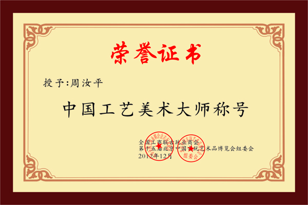 2017年,荣获“中国传统工艺大师”称号的资格证书;