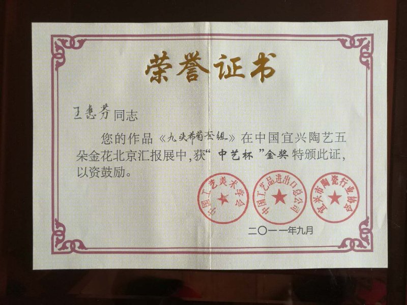 主要获奖经历: 2008年11月,作品《裙风壶》在第十届中国工艺美术大师精品博览会上获“传统艺术” 金奖; 2009年6月,作品《汉君壶》在中国宜兴百名陶瓷艺术家评选活动中荣获金奖; 2009年11月,作品《双线扁灯壶》在第十一届中国工艺美术大师精品博览会上获“创新艺术” 金奖; 2010年10月,作品《抽方壶》在第十二届中国工艺美术大师精品博览会上获“创新艺术” 金奖; 2011年9月,作品《九头希菊套组》在中国宜兴陶艺五朵金花北京汇展中获“中艺杯”金奖。 |