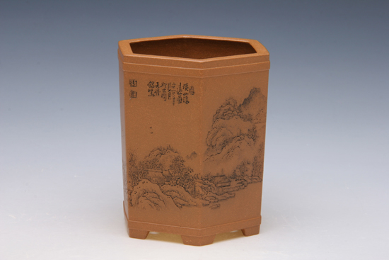 降坡泥六方笔筒