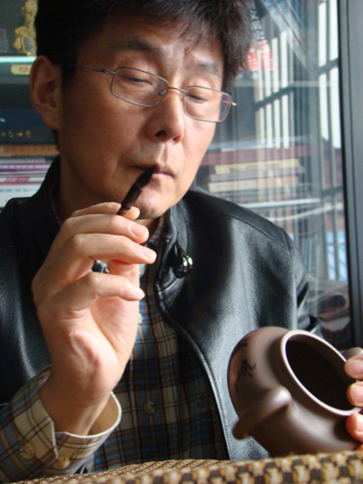 这次尹汉胤先生受周汝平先生邀请,相会宜兴宝山陶瓷工艺厂。作为老宜兴人的尹汉胤先生这次回归故土,感慨颇多,即兴提笔作诗、贺赋。先生挥墨洒脱,纸透力背,书法作品苍劲飞动、刚柔相济,赢得在场阵阵掌声。两位艺术大师相会,一壶两杯一点红,感慨甚多,谈论话题颇为广泛,小到互问身体安康,大到国家形式动态,无所不谈,室内气氛时而紧张时而欢快,无不透入出大家风范。当场周汝平先生随即拿出刚刚制作的紫砂壶,相邀尹老师提笔留字,互相留念!