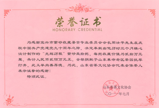江苏宜兴紫砂收藏鉴赏专业委员会会长、宜兴市陶都经济联合会执行会长、中国宜兴紫砂界的领军人物周汝平先生,在庆祝中国共产党成立九十周年之际,也正值山东革命老区临沂地区遭受三百年不遇的特大旱情之时,他义无反顾立刻决定拿出拾把由他历时三个月之久,为庆祝中国共产党成立九十周年而特别精心设计,创作的《光辉历程壶》在山东进行义拍,义拍所得款人民币200万元整全部捐献到了旱情最为严重的浮来春茶园和浏园自然生态园等地区打井一百口之用,使这些地区的旱情得到了及时的缓解。使这些自然生态园又恢复了昔日的优美坏境,呈现出一派生机盎然的自然朝气。 他这一义举得到了山东省茶文化协会和有关省领导的充分肯定和赞颂,得到了革命老区人民的衷心感谢。同时也为庆祝中国共产党成立九十周年献上了一份厚厚的重礼。