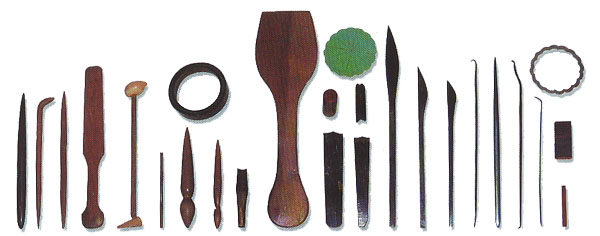 筋纹器壶制作常用工具有:各种样板、凿子、清理筋纹器规格的各种梗及整理壶内筋纹的尖刀、牙子等。