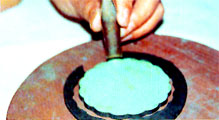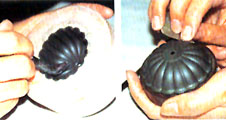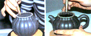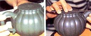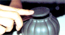 9.用模具制作壶盖,并用专制工具和明针理清盖内、外的筋纹。