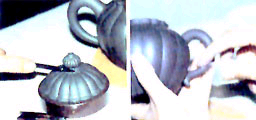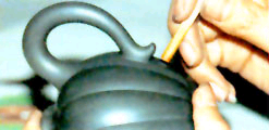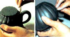 10.用脂泥粘接壶嘴、壶把、并用尖刀、明针加工清理。