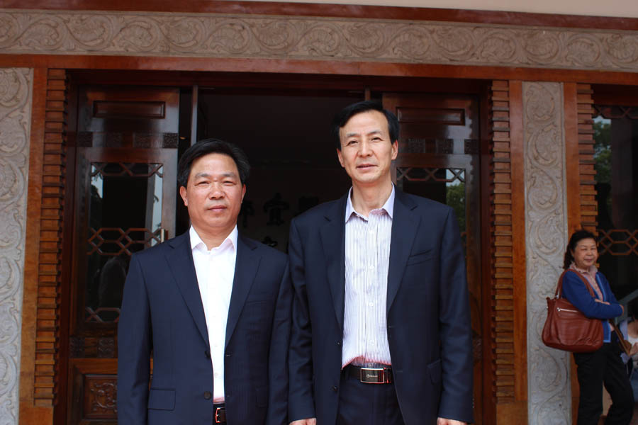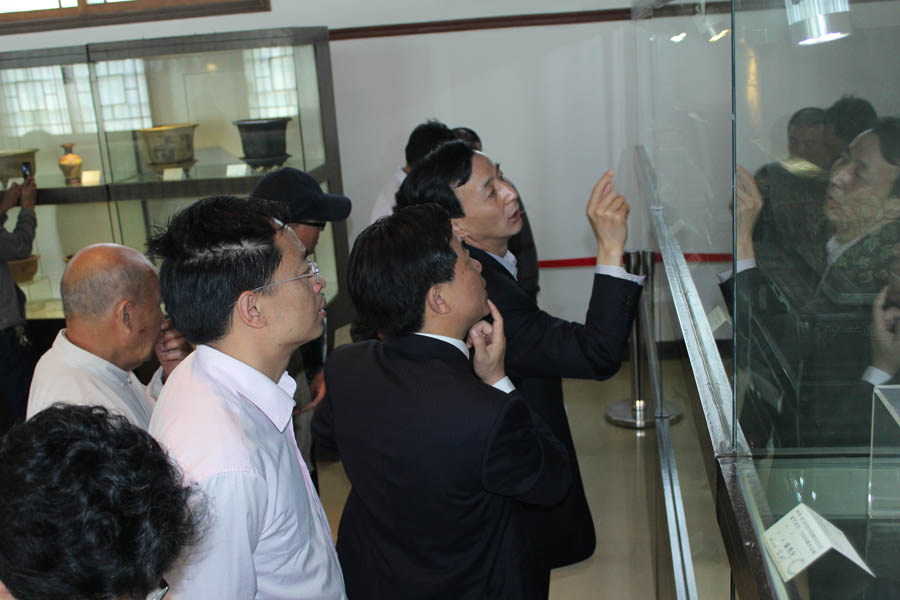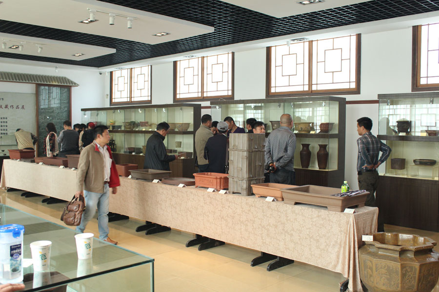 中国宜兴紫砂收藏鉴赏专业委员会会长周汝平在为参会贵宾介绍古代花盆作品