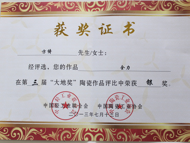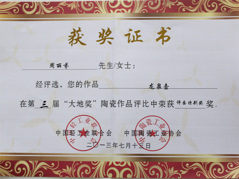 在2013年7月由中国轻工业联合会、中国陶瓷工业协会联合举办的第三届“大地奖”陶瓷作品评比中荣获“评委特别奖”。