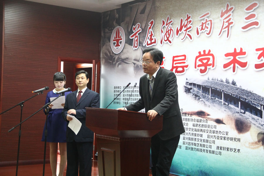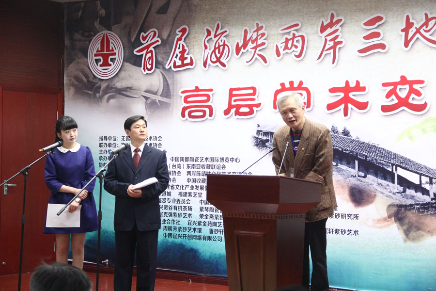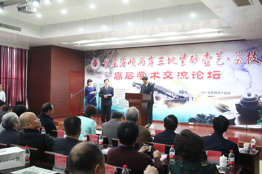 2015年4月15日,中国陶都陶瓷城陶瓷艺术国际博览中心气氛热烈,茶香四溢。由无锡市科学技术协会指导,宜兴市科学技术协会联办,宜兴市陶都经济联合会主办,中国陶都陶瓷城陶瓷艺术国际博览中心、中国紫砂文化研究会承办,丁蜀镇人民政府、东南亚(台湾)收藏联谊会、台湾高雄市经济产业发展协会、两岸陈靖姑文化艺术交流协会、两岸榕台经贸旅游交流协会、中国收藏家协会、世界华人收藏家大会、福建省茶叶学会、福建省文化产业发展促进会、中国国际海洋摄影协会福建分会、浙江义乌茶文化研究会、福建名德投资有限公司、中国宜兴紫砂收藏鉴赏专业委员会、中国紫砂博物馆、宜兴紫砂文化海峡两岸交流基地办公室、宜兴农林协会、宜兴灵谷有机茶场、紫琴陶瓷艺术馆、中国宜兴方井紫砂城、宜兴方壶堂紫砂研究所、凤华茶业、紫润香张克强紫砂艺术、荣金斋紫砂文化艺术馆、宜兴陶醉茶文化有限公司、宜兴金凰生态林果专业合作社、宜兴紫金苑陶艺有限公司、宜兴昌华陶艺有限公司、史可文紫砂艺术馆、咸子晴紫砂艺术馆、周明芳紫砂艺术馆、香砂轩紫砂艺术馆、宜兴市致力科技开发有限公司、中国宜兴开创网络有限公司、读泥斋紫砂艺术、可心紫砂文化专业委员会等27家单位协办的首届海峡两岸三地紫砂壶艺茶技高层学术交流活动顺利召开了,紫砂壶艺和传统茶技在这里交融,两岸三地的茶人在这里拥抱。为中国茶文化与壶文化的结合奉上了高层次、有深度的献礼!