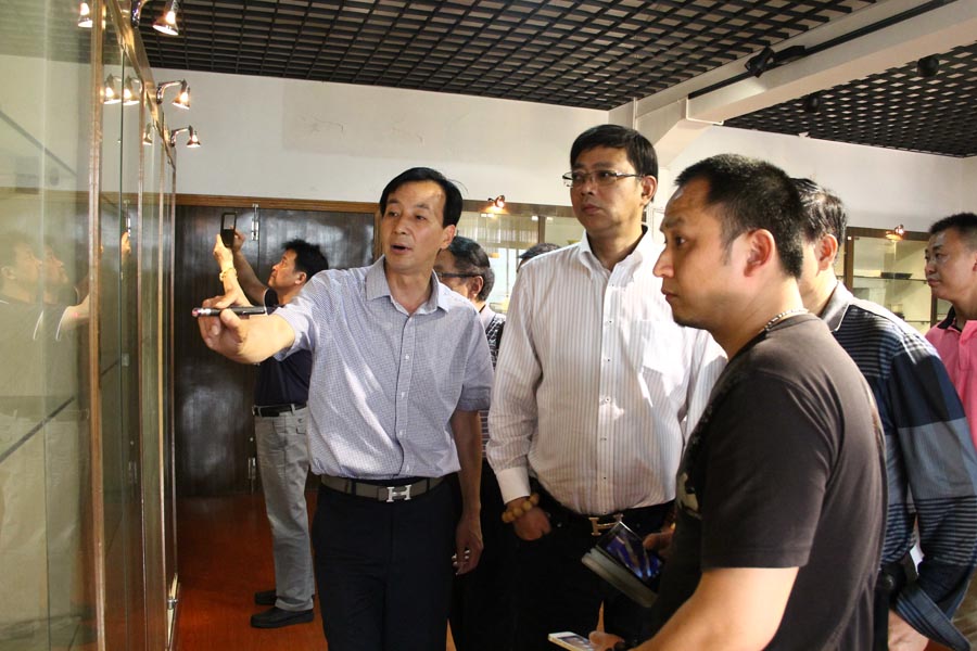 2015年5月,在这个槐花飘香、阳光明媚的季节,宜兴陶雅紫砂艺术文化园迎来了一位尊贵的客人——徐湖平。徐湖平先生于1973年进入南京博物院,1985年8月任副院长,2001年1月任南京博物院院长,2006年1月任南京博物院书记,享受国务院政府特殊津贴专家。现任江苏省第九届政协委员、中国博物馆学会常务理事,江苏省博物馆学会理事长、文化部文化市场发展中心艺术品评估委员会委员、江苏省吴文化研究会理事长、中国文物学会常务理事、江苏民间收藏研究会会长等多种团体的职务。此次徐湖平先生受周汝平先生的邀请参观了陶雅紫砂艺术文化园明清紫砂博物馆。