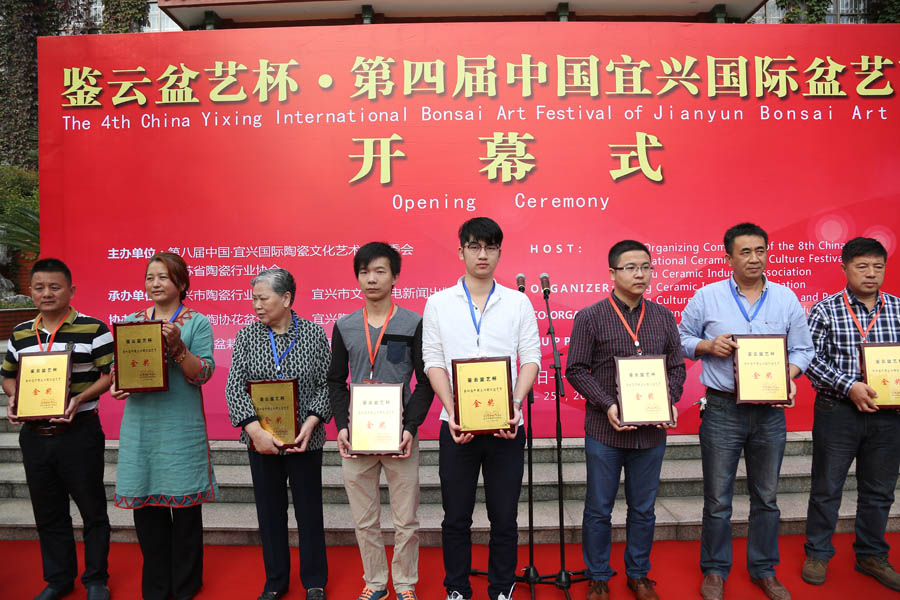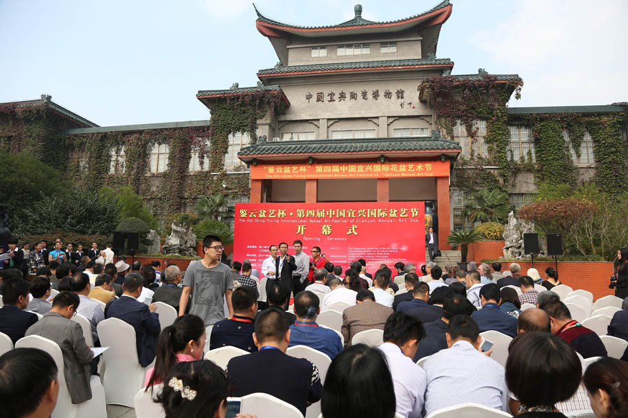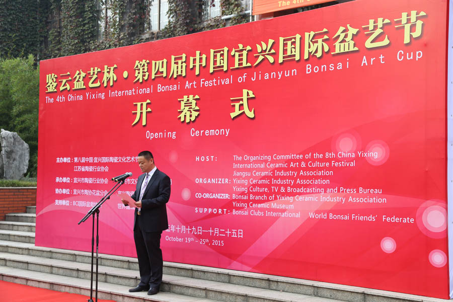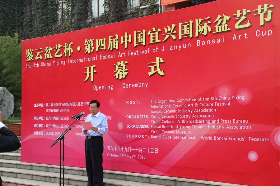 鉴云盆艺杯·第四届中国宜兴国际盆艺节开幕式在中国宜兴陶瓷博物馆隆重举行,由第八届中国·宜兴国际陶瓷文化艺术节组委会与江苏省陶瓷行业协会联合主办,承办单位有宜兴市陶瓷行业协会、宜兴市文化广电新闻出版局,由宜兴市陶协花盆分会、宜兴陶瓷博物馆进行协办,并得到了BCI国际盆栽协会和世界盆栽爱好者联盟的支持,有多位外国友人前来参加。此次盆艺节将从2015年10月19日持续至10月25日。
