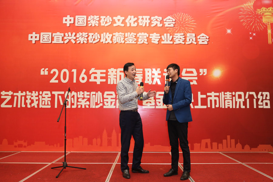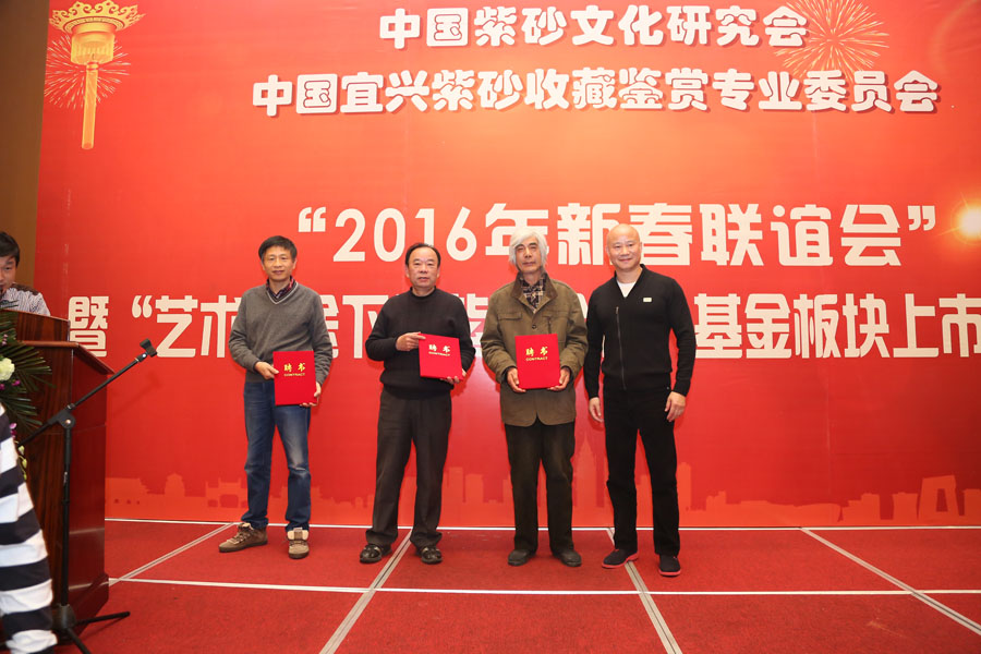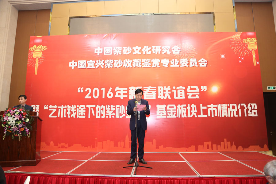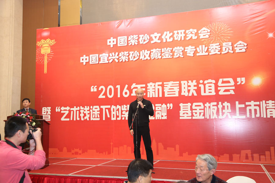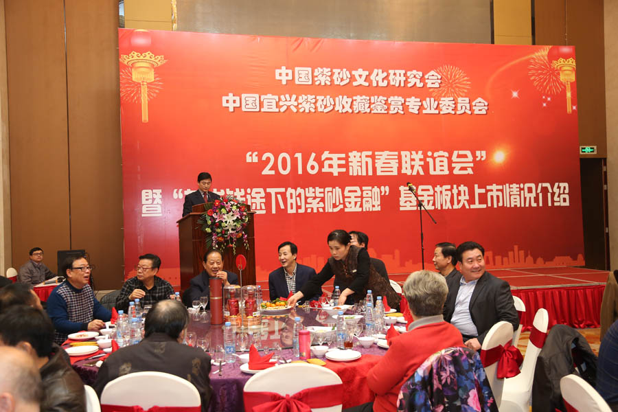 在即将迎来2016年的新春之际,由全联民间文物艺术品商会紫砂文化研究会和中国宜兴紫砂收藏鉴赏专业委员会举办的“2016年新春联谊会”暨“艺术钱途下的紫砂金融”基金板块上市介绍会,于1月4日晚在宜兴紫砂宾馆隆重举行。鲍志强、邱玉林、顾绍培等多位紫砂大师与各领导前来参加,席间气氛十分热闹,大家相聚一起共享欢乐。