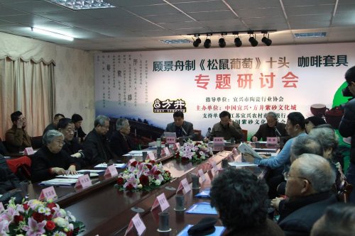 为解决这么多疑问,2016年1月7日,宜兴陶瓷行业协会、中国宜兴方井紫砂文化城组织程辉、周汝平、徐汉棠、徐秀棠、李昌鸿、汪寅仙、鲍志强、顾绍培、潘持平、时顺华等二十多名国内顶尖的紫砂大师、紫砂领域专家参加对此壶进行专项研讨,他们在泥料(釉水)、创作理念、艺术特点、制作技艺、烧成配套等方面对“顾景舟制《松鼠葡萄》十头咖啡套具”进行分析、研究,在总结壶艺泰斗顾景舟在紫砂艺术方面的杰出造诣的同时,分析、探讨此壶的相关艺事。