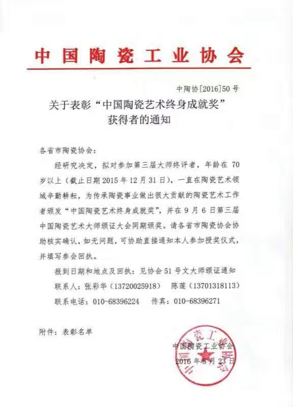 程辉 2016年8月23日 荣获中国陶瓷协会 中国陶瓷艺术终身成就奖