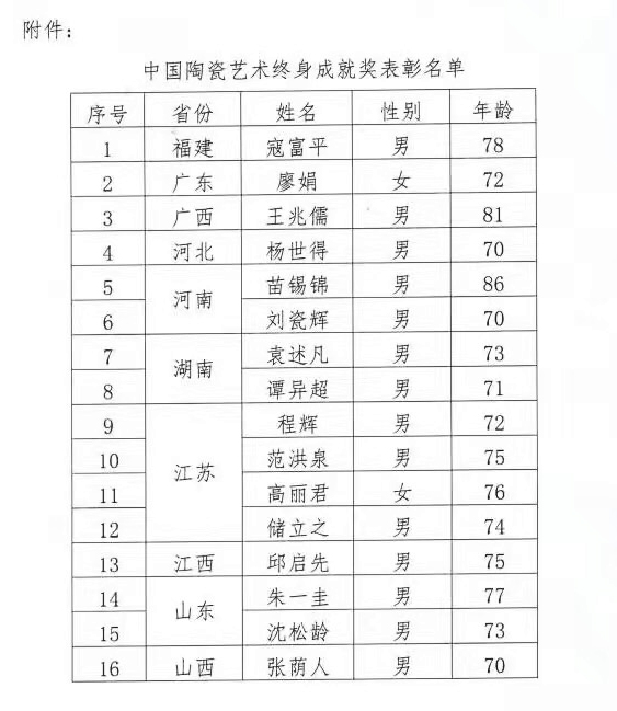 8月23日,中国陶瓷工业协会决定,为全国16位在陶瓷艺术领域辛勤耕耘并做出贡献的陶艺工作者颁发“中国陶瓷艺术终身成就奖”,江苏省有4位大师入选。